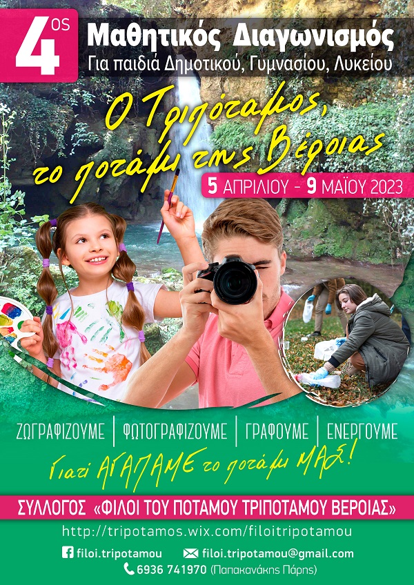 Ο Σύλλογος «ΦΙΛΟΙ ΤΟΥ ΠΟΤΑΜΟΥ ΤΡΙΠΟΤΑΜΟΥ ΒΕΡΟΙΑΣ» με την αρωγή της Περιφερειακής Ενότητας Ημαθίας και του Δήμου Βέροιας διοργανώνει μαθητικό διαγωνισμό τριών ανεξάρτητων κατευθύνσεων: Ζωγραφικής, Φωτογραφίας και Προγραμμάτων Περιβαλλοντικής Εκπαίδευσης, σε τρεις διαγωνιστικές ηλικιακές ομάδες (1η Δ, Ε, Στ Δημοτικού- 2η Α, Β, Γ Γυμνασίου- 3η Α, Β, Γ Λυκείου) με θέμα το ποτάμι της πόλης μας, τον Τριπόταμο.